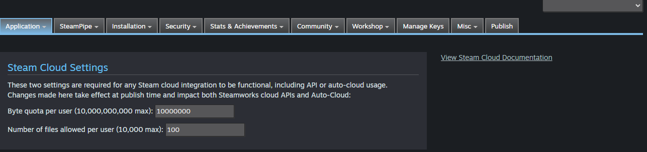 우선, Steamworks에서 Application -> SteamCloud로 이동하면 아래와 같은 그림이 나온다.
