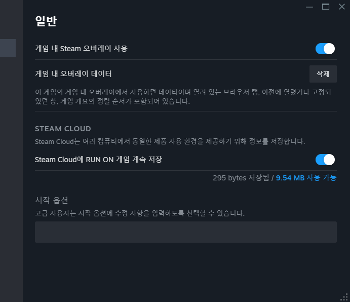 패키징이 다 됐다면 스팀을 로그인한 상태로 게임을 실행시켜야 한다. 그렇지 않으면 스팀 클라우드에 데이터가 저장되지 않는다. 게임을 실행시키면 라이브러리에 초록색으로 실행 중이라고 나오게 되는데 마우스 오른쪽 클릭 -> 속성 -> 일반 -> Steam Cloud에 게임 계속 저장을 On 한 상태여야 한다.