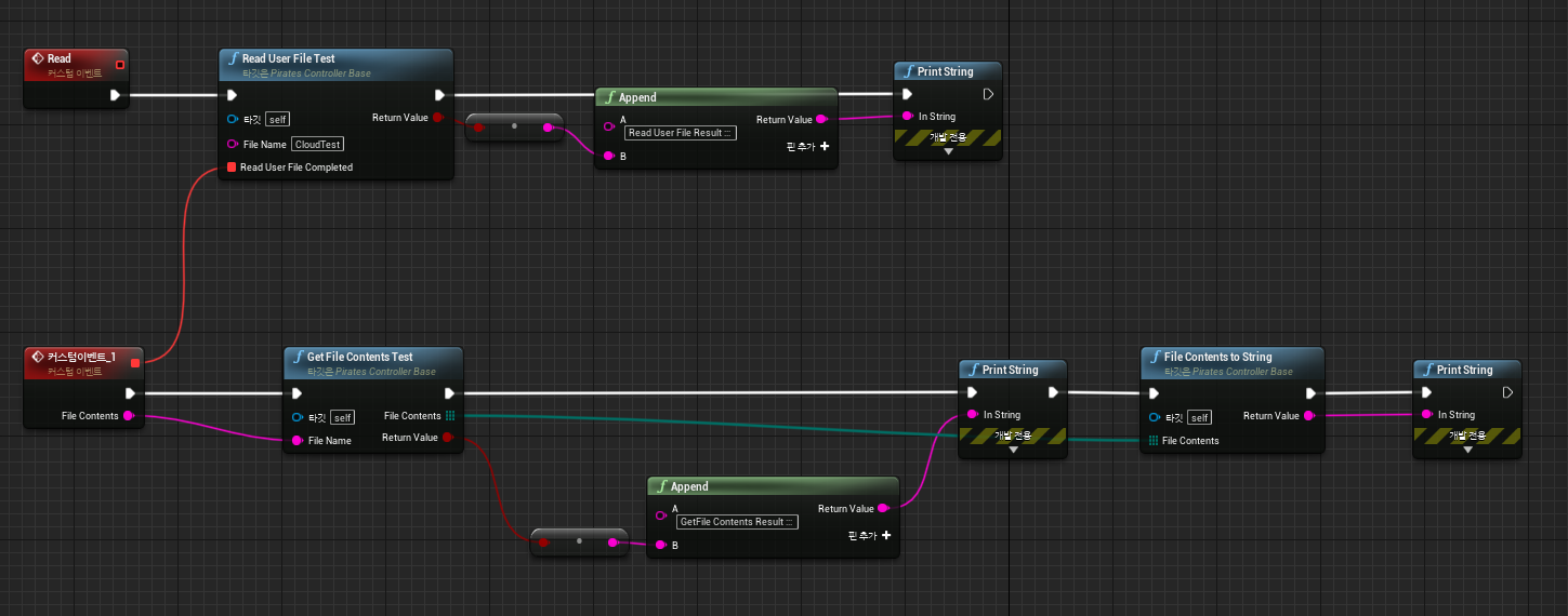 코드에서 특별한 것은 없고, 함수 매개변수 마지막에는 델리게이트를 PayLoad로 사용하기 위해 넣어주었다. 블루프린트에서 함수를 호출하고 리턴을 받아서 사용하기 위해 넣었다. Read가 끝나면 OnReadUserFileCompleteDelegates와 연결된 함수가 호출되는데, 여기서 블루프린트에 바인딩된 함수를 호출하게 했다.